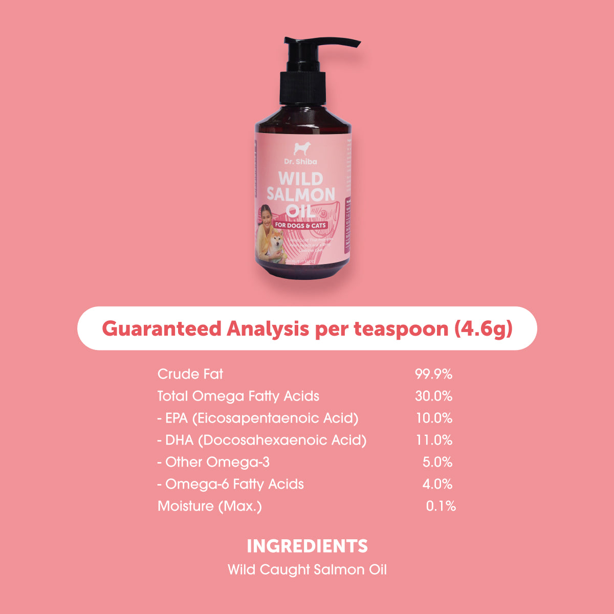 Dive into vitality with Dr. Shiba's Wild Salmon Oil – a marine elixir for skin, coat, heart, and immune cheer. Watch your pet revel in the sea of wellness, one drop at a time!